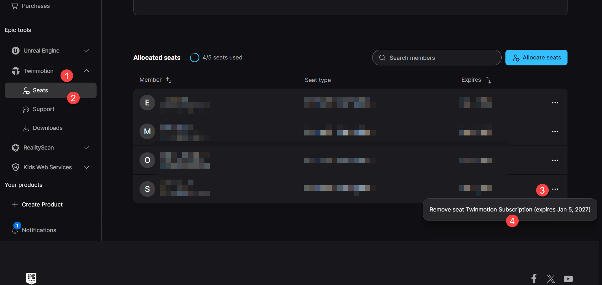 4. To remove a member's license and assign it to another, go back to "Seats" under the "Twinmotion" tab, click the three dots next to the member, and click "Remove seat."