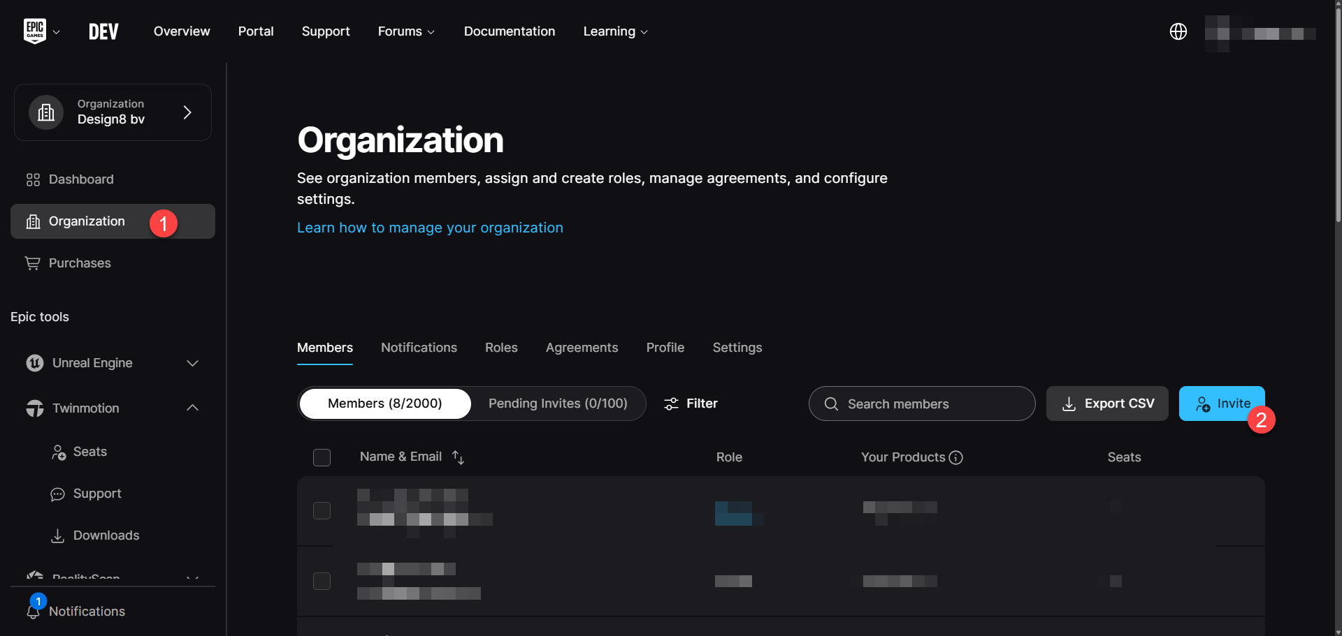 3. Once you have invited all your members, you can go to the Seats tab under Twinmotion, click on “Allocate seats”, choose a Seat Type, search for the member you want to assign the license to and finally click on Add.